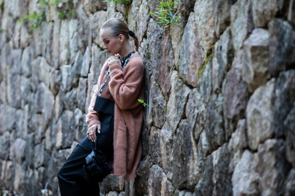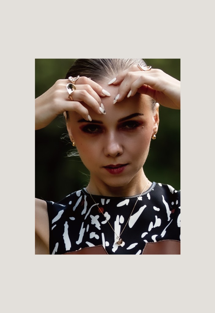 ルックに合わせたのは@saka_intl の彫刻的なカービングが美しいK10イエローゴールドのジュエリー。