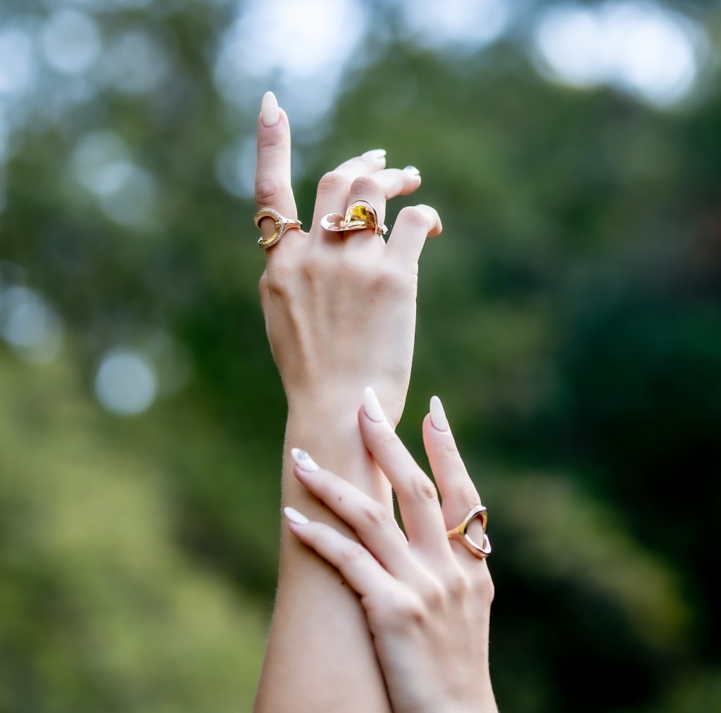 SAKAのシルバーリングは彫刻的カービングが美しく繊細な手元に。デザイナー坂さんと直接お話できるポップアップでデザインにまつわるお話をぜひ伺ってみて。